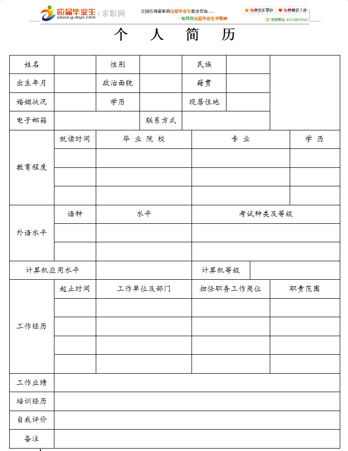 简历即对履历的简要陈述,又称履历表,英文简称CV,常用于个人求职、申请,但也可作为非求职者的经历简述。下面YJBSY小编为求职者提供的一份标准简历表格word格式,下载后可直接使用或根据实际情况进行修改。下面是简历表格的样式截图,仅供参考,具体效果你可以下载查看使用。祝您职场顺利,早日找到称心如意的工作!